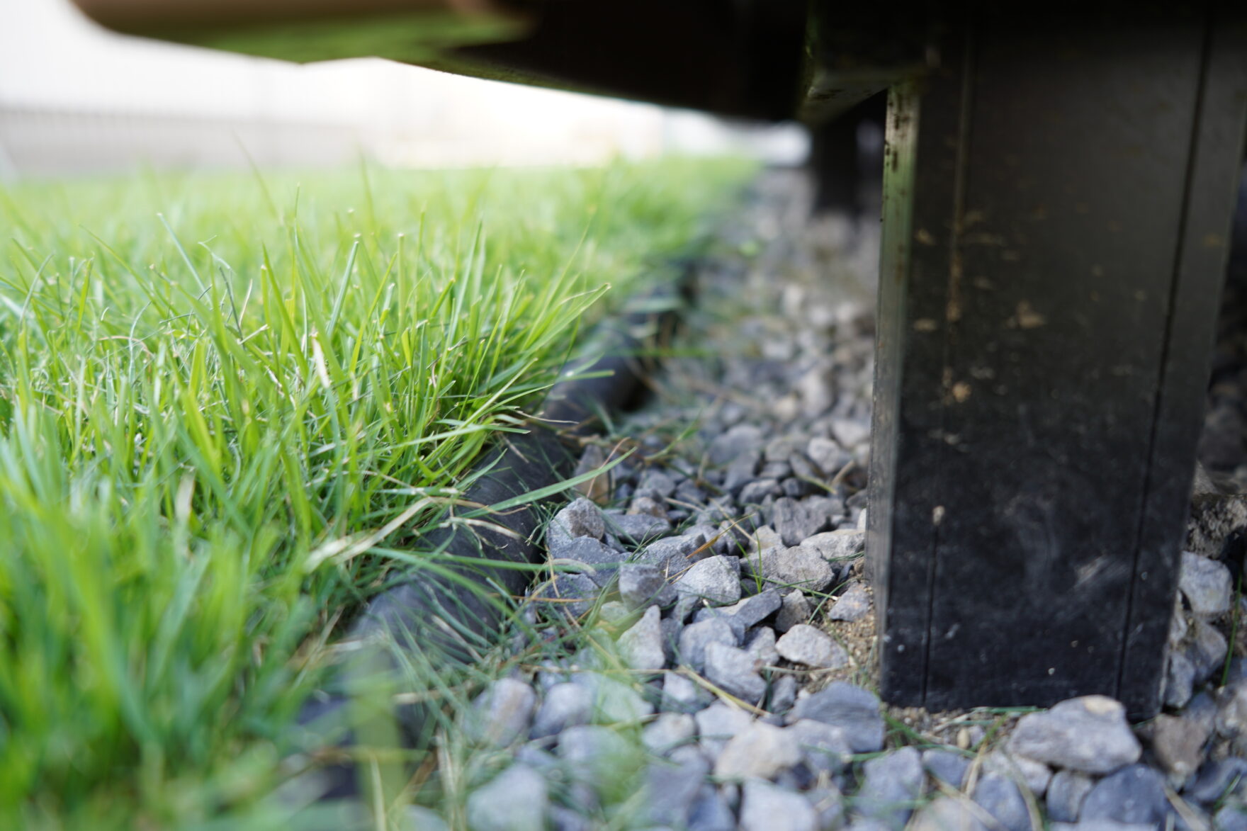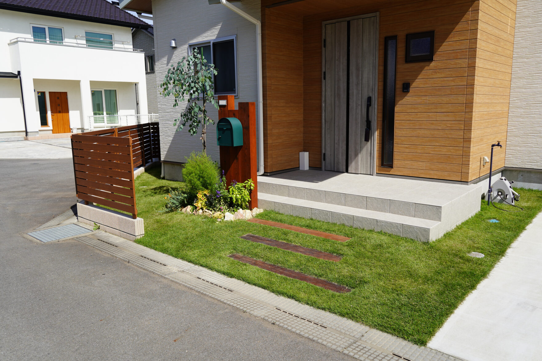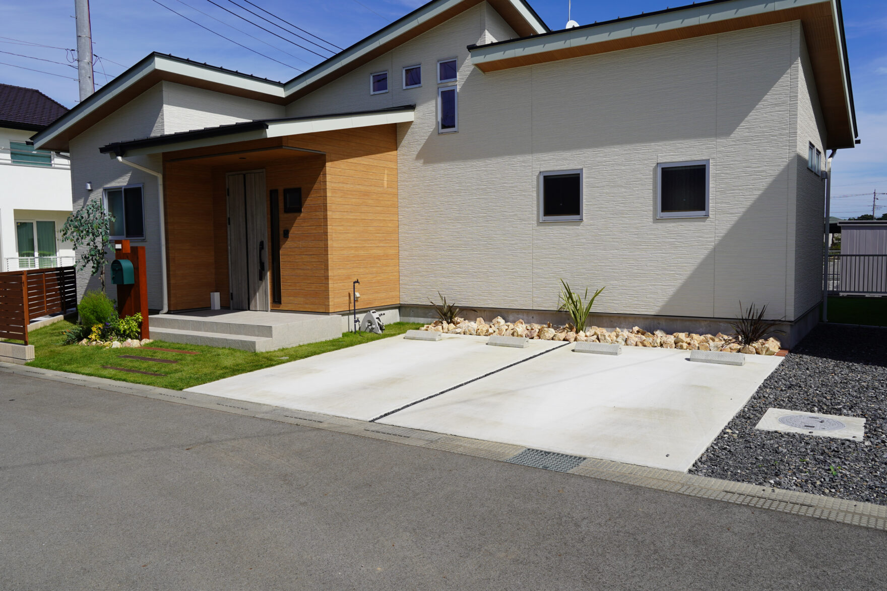 駐車スペースには、クラッシュロック(マールイエロー)を採用。植栽とのバランスも良く、明るい雰囲気に仕上がりました。※天然石・・・東洋工業 クラッシュロック